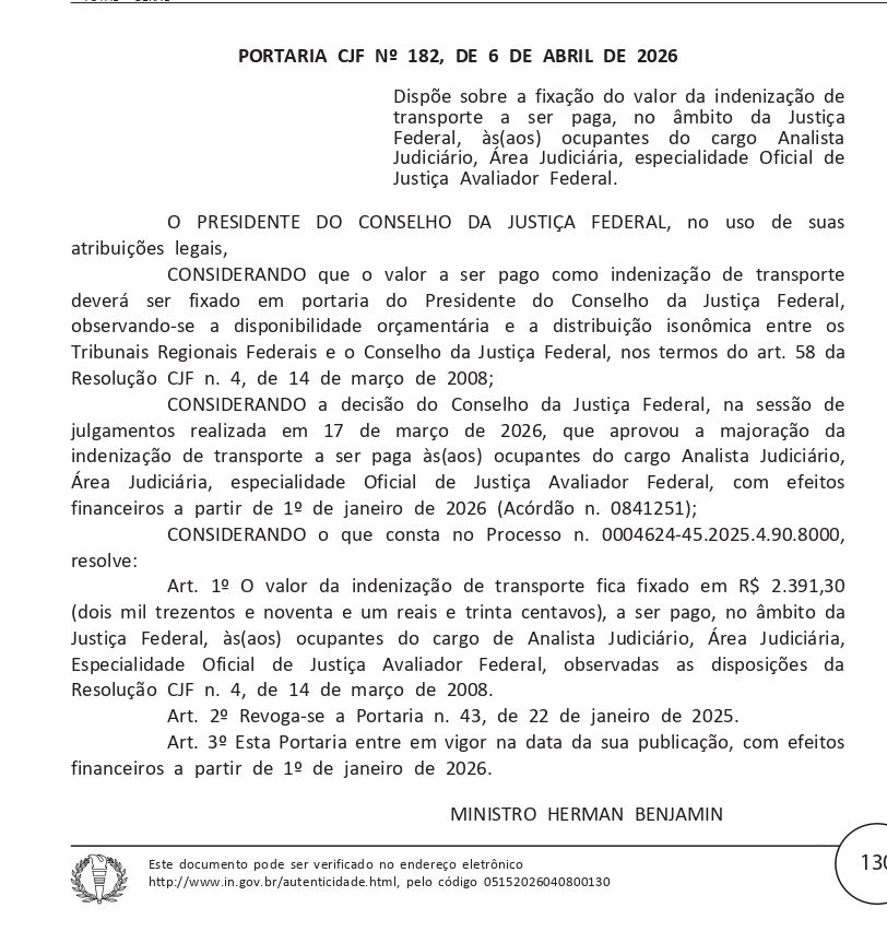 O Conselho da Justiça Federal (CJF) publicou, no Diário Oficial da União desta quarta-feira (08), a Portaria nº 182/2026, que fixa o novo valor da Indenização de Transporte paga aos Oficiais de Justiça.